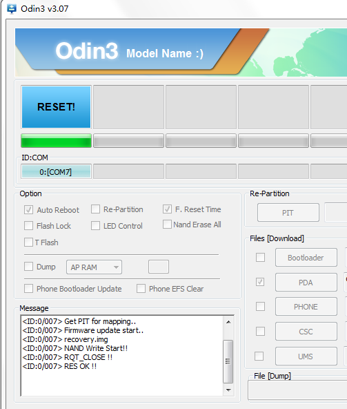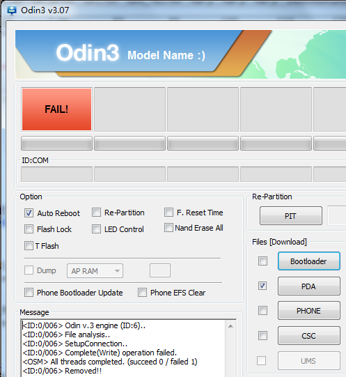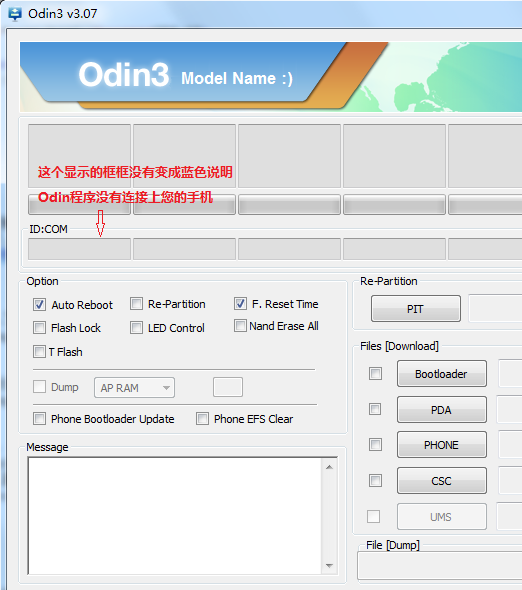 2) 请检查在Odin刷机过程中,Odin程序是否始终保持和您的手机的连接。如果保持连接,则Odin界面中ID:COM下面的矩形框框是蓝色的。
